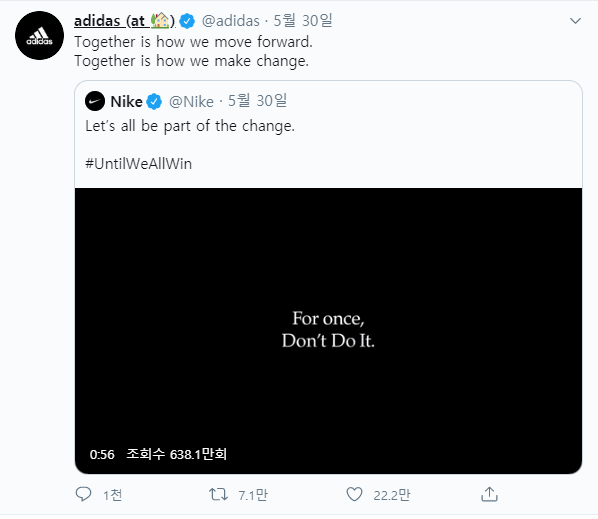 스포츠 업계의 큰 라이벌인 나이키의 캠페인에 대해서 아디다스는 'Together is how we move forward. Together is how we make change.(함께 하는 것이 우리가 앞으로 나아갈 수 있는 방법이다. 함께하는 것이 우리가 변화를 만드는 방법이다.'라는 말을 전하며 역사상 최초로 나이키의 게시물을 리트윗 했다.
