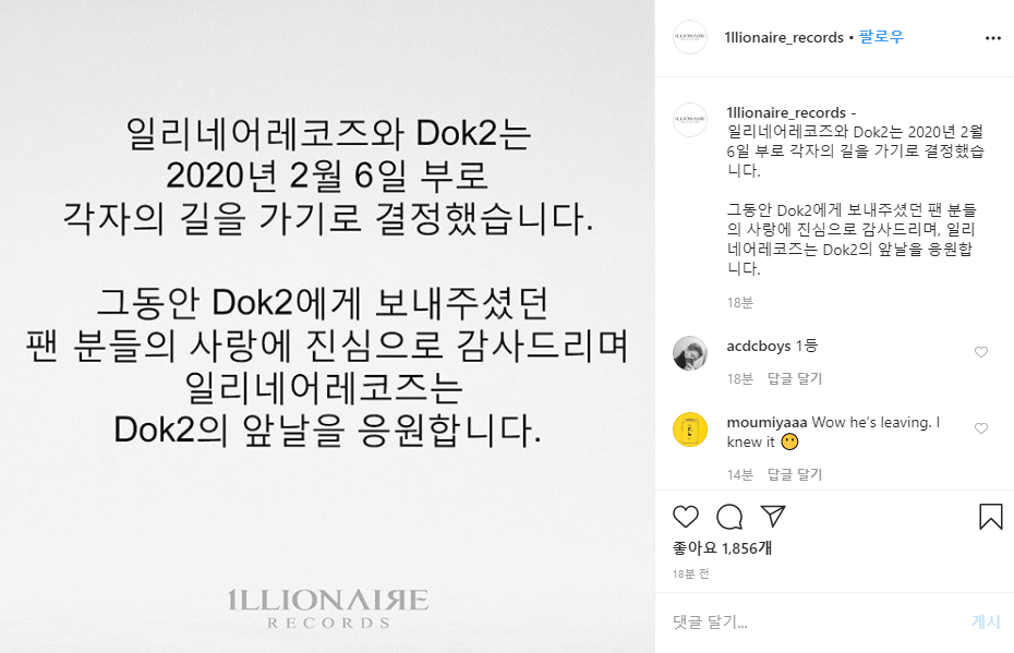 현 시간 일리네어 레코즈 인스타그램에 도끼와 일리네어 레코즈는 다른 길을 간다는 공지가 올라왔다. 확실히 어떤 연유로 각자 길을 가게 되었는지 아직 모르지만, 일리네어 레코즈의 전신이라고 볼 수 있는 도끼가 탈퇴했다는 것은 꽤나 큰 충격의 파장이다. 탈퇴 이유 및 자세한 소식은 <SIP MAGAZINE>에서 기다려보자.